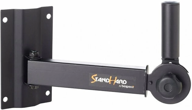 Wall mount steel speaker bracket with Ø 35 mm pole. It features a tilt and swivel angle adjustment.