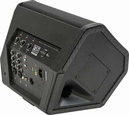 Universal portable active speaker system with great sound, high performance and built-in Li-ion battery 22.2V/2.6Ah. Battery life is up to 6 hours of operation. The plastic enclosure is equipped with a 6.5″ bass speaker and 3x 2.75″ neodymium high-performance speakers, where each is slightly turned in a different direction for a wider radiation angle. It also has a built-in Bluetooth player with the TWS function, which allows pairing two speakers to one sound source. It has 2 universal inputs (XLR/jack 6.3mm) with separate 2-p. corrections, effects, volume control and 1 line input (2x RCA). The built-in digital amplifier contains a 24bit / 96kHz DSP processor. The speaker system can also be placed on a stand with a diameter of 35 mm.