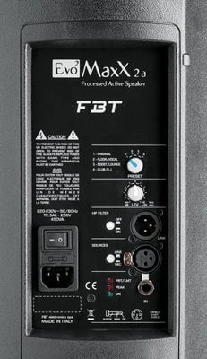Two-way, bi-amplified, bass reflex design speaker from Evo2MaxX series that features an advanced digital sound processor with dynamic equalizations and sophisticated dynamic limiters for improved sound quality and SPL of up to 128 dB. The sound is more relaxing and natural and the four DSP presets (Original, Floor/Vocal, Boost/Lounge, Club/DJ) provide quick dynamic equalization and protection of contours for any acoustically challenging venue. The speaker is equipped with 10” woofer with 2” voice coil and 1” throat exit B&C compression driver, both custom made for FBT with a weather resistant coating which allows for use in covered outdoor applications, and Class D power amplifiers (400W LF and 100W HF) with high efficiency switch mode power supplies and passively cooled circuitry. The speaker’s sturdy, gas-injected polypropylene moulded enclosure is engineered to contain undesired resonance and features ergonomic carrying handles, M10 fly points, a top-hat speaker stand socket and a stage monitor taper – all included to ensure superb versatility for live sound events and permanent installations. The control panel provides a balanced XLR/6.3mm input and XLR link output, Volume control, EQ presets settings, HP filter and three status LED indicators. Frequency response: 58 Hz-20 kHz. Dimensions: 352 x 550 x 307 mm. Weight: 12 kg.