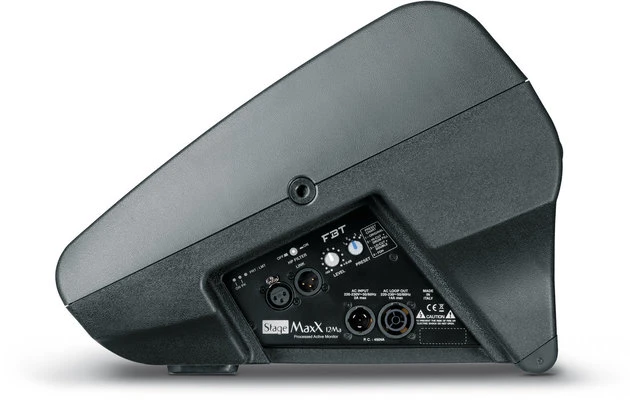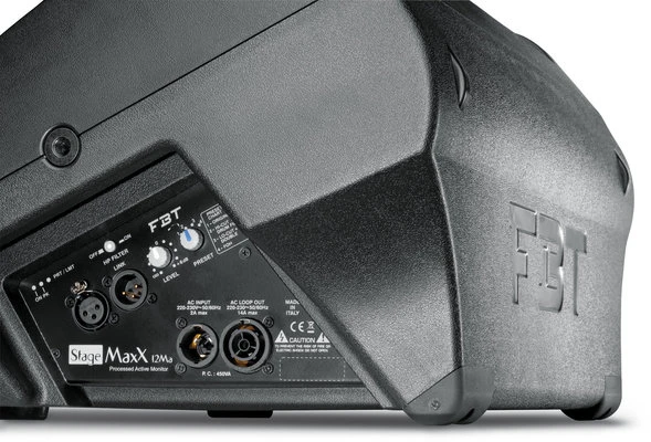 Low-profile, compact two-way active stage monitor from StageMaxX series that has been inspired by the need to have a product specifically designed and engineered for use as stage monitor, overcoming all these compromises for a full user satisfaction. It features a 12” B&C loudspeaker custom made for FBT and coaxially mounted with a B&C 1” exit throat compression driver. The coaxial configuration allows perfect alignment of the acoustic centres of the transducers, guaranteeing symmetry of dispersion and improving focus of the stereo image in Left-Right configuration. Bi-amplification design with high dynamic Class D amplifiers delivers 400W + 100W RMS through a switch mode power supply. The Digital Signal Processor with 4 factory equalization presets (Original, Hi-Cut/Drum Fill, Lo-Cut/Double, FOH) provides simple and efficient EQ adjustment to optimize the acoustical response for different applications. The control panel provides a XLR/6.3mm input and XLR link output, volume control, HP filter and three frontal status LED indicators. The speaker’s sturdy gas-injected polypropylene moulded enclosure helps to avoid undesired resonance and features a weather resistant coating under the grill to protect the drivers. It also features two M10 rigging points and three ergonomic integrated carrying handles, one frontally placed to easily drag and move the monitor on stage and replaceable Teflon feet ensure sliding on stage with minimal wear. The cabinet has 35° or 55° tilted front panel for an optimal listening distance for single or multiple users. Frequency response: 60 Hz-20 kHz. Maximum SPL: 130 dB. Dimensions: 550 x 289 x 392 mm. Weight: 13.6 kg.