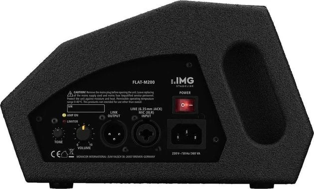 Active stage monitor (monitoring) power max. 300 W. Flat and very compact design. Equipped with 4 x 10 cm (FaitalPRO, 4 x 4 “) wideband speakers with neodymium magnets. Control panel offer: input combo connector XLR / 6.3 mm Jack Mic / Line. Output OUT XLR connector. VOLUME and TONE control (sound color) LED Signal and limiter indication High-quality wooden cabinet with protective metal grille 2 x M10 and 2 x M6 threaded inputs for stand adapter or mounting device Supplied with terminal for mounting, eg on a microphone stand Optional accessories : protective carrying case FLAT-M200BAG.