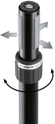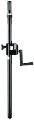 Distance rod with hand crank and »Ring Lock«. Loudspeakers can be attached tightly and safely with the patented Ring Lock system. A comfortable hand crank allows you to adjust the height of even the heaviest of speakers both easily and safely. An M20 threaded bolt and the patented expanding mandrel guarantee a professional and exceptionally safe system. Special features: patented expanding mandrel system »Ring Lock«, vibration-free connection due to moveable plastic splints, push-button system and hand crank avoid uncontrolled reverse motion, locking screw provides additional safety, M20 bolt for precise and vertical fit. Material: steel. Height: from 920 to 1,520 mm, Tube end(s): »Ring Lock« diameter 35 to 37 mm, threaded bolt M20. Weight: 3,86 kg. Colour: Black.