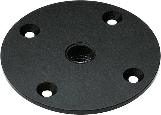 Zinc die-cast connector plate. Attachable to speakers. Diameter 105 mm. Four 6.5 mm holes. May be used with distance rods with M20 bolt. Height: 25 mm. Weight: 0,24 kg. Colour: Black.