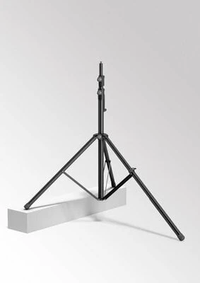 With the help of this adapter, you can compensate for uneven floors, stairs, steps or sloping positions in no time at all. The leveling leg is mounted one-time on one of the legs of the wind-up stand »3000« and secured with a clamp. The required length is infinitely variable and allows a height adjustment of max. 200 mm. If no leveling is required, the adapter simply remains in the initial position on the stand base.