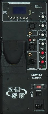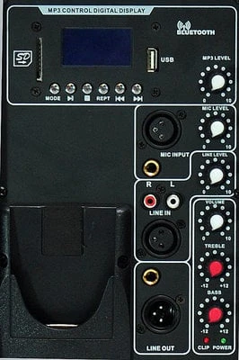 Active speaker cabinet with power output of 150W that is equipped with a 12” driver (8 Ohm) – ideal equipment for rehearsal rooms and for smaller events. The rear panel provides not only a Volume control, but also a USB port and an SD card reader that can be both used as a data source for a built-in MP3 player with dedicated Volume control and LCD screen. It also provides an XLR microphone input, RCA and XLR input for line in, and line out that can be connected via XLR or 6.3mm connector. Other features include a 3-band EQ and Bluetooth technology for wireless connectivity. Sensitivity: 98 dB. Frequency range: 22 Hz-20 kHz.