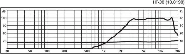 Miniature PA horn tweeter Monacor HT-30 with dimensions 67 x 67 x 47 mm. This tweeter provides linear and wide bandwidth reproduction. It also offers high power capability due to ferrofluid.