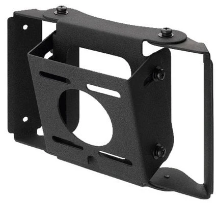 Wall support for speaker systems, black lacquered. Also suitable for flexible corner mounting due to adjustable mounting brackets. Pivoting mounting plate (approx. 17°), to be secured with supplied screws. Supplied with 4 fixing screws.