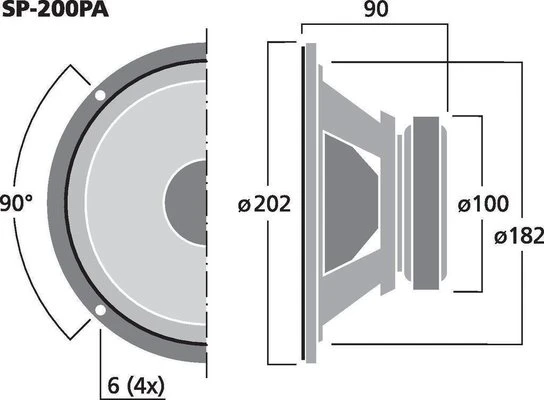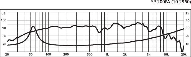 PA and power bass-midrange speaker, 100 W, 8 Ohm. Peak music power output: 200W, Frequency range: f3-4,000 Hz, Sensitivity: 91 dB/W/m, Dimensions: 202 mm x 90 mm, Weight: 1,255kg.