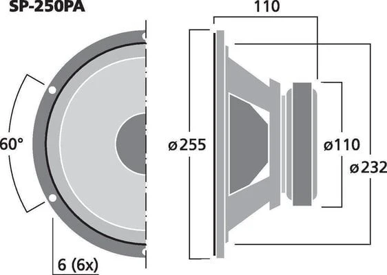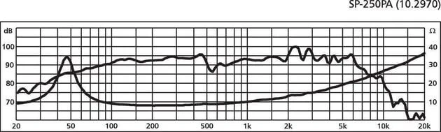 PA and power bass-midrange speaker, 125 W, 8 Ohm. For general applications in the bass and midrange. Peak music power output: 250W, Frequency range: f3-4,500 Hz, Sensitivity: 92 dB/W/m, Dimensions: 255 mm x 110 mm, Weight: 1,97kg.