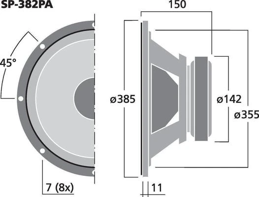 Universal bass speaker, 150 W, 8 Ohm. For bass applications, also in power speaker systems. Peak music power output: 300W, Frequency range: f3-4,000 Hz, Sensitivity: 94 dB/W/m, Dimensions: 385 mm x 150 mm, Weight: 3,9kg.