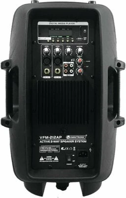 Active 2-way speaker system (12″) with 140 W for PA and DJ applications with audio player and Bluetooth. Includes MP3 player with Bluetooth receiver, blue LCD and IR remote control, SD card slot and USB input. Stream music wirelessly from your mobile devices (e.g. smartphone, tablet) via Bluetooth. Class A/B circuitry: optimum sound and power at low weight and compact dimensions. 2-way bass-reflex system with 30 cm woofer and 2.5 cm tweeter. 2 mic input with separate level controls, line input, RCA, 3.5 mm AUX input. Master control with 2-way tone control, clip and power LED. Line output for linking further active speaker systems. Stable plastic housing with protective grille and handles. Flange for stand installation. Can be used as floor monitor, standing, on a speaker stand or wall holder. 2 wheels for easy transport.