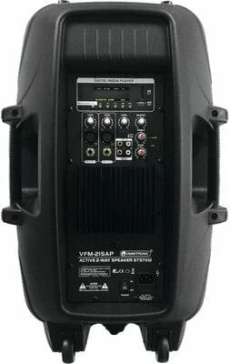 Active 2-way speaker system (15″) with 150 W for PA and DJ applications with audio player and Bluetooth. Includes MP3 player with Bluetooth receiver, blue LCD and IR remote control, SD card slot and USB input. Stream music wirelessly from your mobile devices (e.g. smartphone, tablet) via Bluetooth. Class A/B circuitry: optimum sound and power at low weight and compact dimensions. 2-way bass-reflex system with 38 cm woofer and 2.5 cm tweeter. 2 mic input with separate level controls, line input, RCA, 3.5 mm AUX input. Master control with 2-way tone control, clip and power LED. Line output for linking further active speaker systems. Stable plastic housing with protective grille and handles. Flange for stand installation. Can be used as floor monitor, standing, on a speaker stand or wall holder. 2 wheels for easy transport.