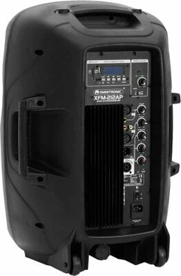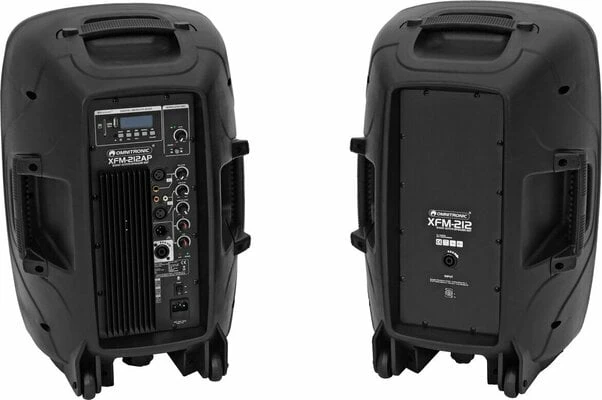 Set consists of one active speaker with integrated amplifier and one passive speaker. 2-way bassreflex systems with 30 cm woofer (12″) and 3.4 cm tweeter (1.34″). MP3 player with Bluetooth receiver and IR remote control, SD card slot and USB input. Stream music wirelessly from your mobile devices (e.g. smartphone, tablet) via Bluetooth. UHF receiver unit and matching wireless microphone. Operation of the hand-held microphone via 2 x AA batteries (not included). 1 mic input with separate level controls, 1 line input XLR/6.3 mm jack) with separate level control, XLR output for linking further active speaker systems. Master control with 2-band EQ, clip and power LED, Limiter for overload protection. Light-weight black plastic enclosure with metal grille and carrying handle. 36 mm flange for stand installation and delivery includes speaker cable. Controlling by IR remote control.