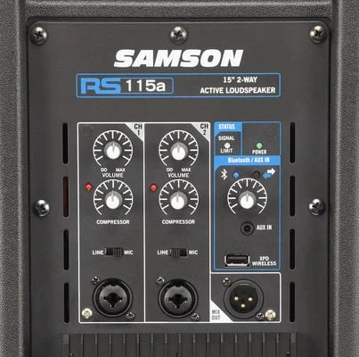 The RS115A speaker features an onboard mixer equipped with two selectable Mic/Line XLR-1/4″ combo input channels with variable compressor controls. An additional channel offers an 1/8″ line level input, Bluetooth connectivity and a USB Wireless port for use with Samson XPD wireless microphone systems (sold separately). The RS115A also includes an XLR Mix output for daisy chaining additional speakers to expand your sound system.