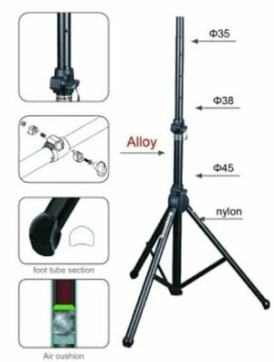 Air-cushion Speaker Stand. Dual-block mechanism holding telescopic tube for reliable operation; without the need of safety pin. Easy to adjust the height of speaker cabinet. Air cushion mechanism prevents the speaker cabinet from fall quickly and meanwhile ensures safe operation.